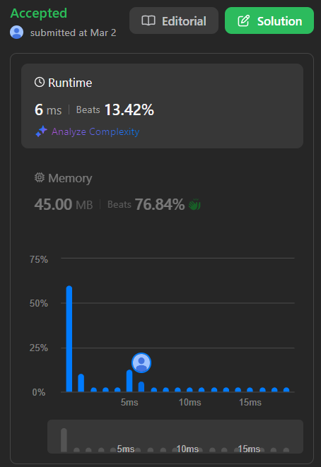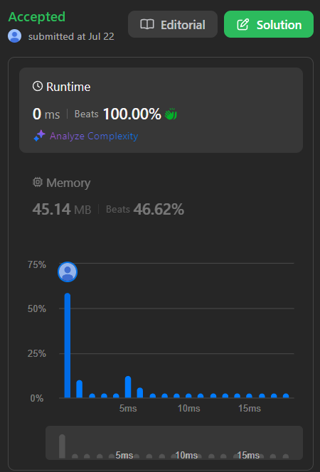 제 코드는 Runtime 결과를 보면 알 수 있듯이 효율적인 코드가 아니지만, 일단 저는 맨 처음에 이 문제를 풀 때는 시간, 공간 복잡도를 생각하지 않고 일단 푸는 것을 우선시했습니다. 그 후에, 점점 다듬으면서 효율성을 높이면 되니까요.