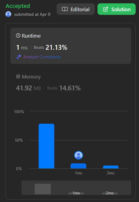 - 추가적인 배열이나 리스트를 사용하지 않고, 상수 공간만 사용하므로 공간 복잡도는 O(1)입니다.