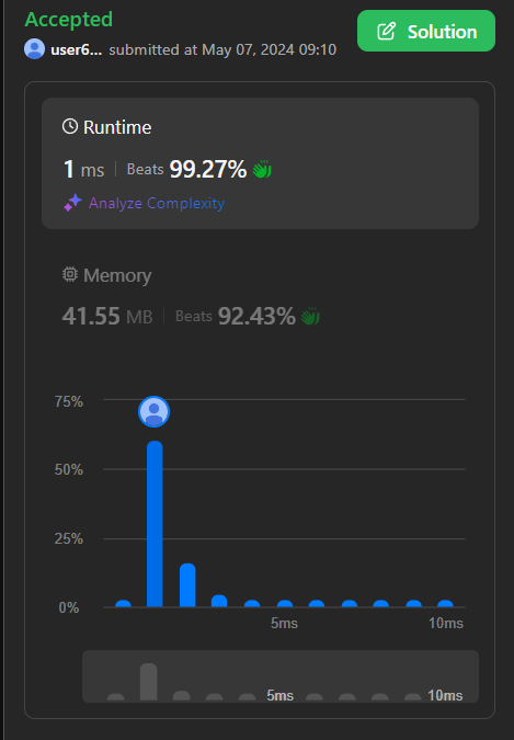 - O(1) : 추가적인 데이터 구조를 사용하지 않으므로 공간 복잡도는 O(1)입니다.