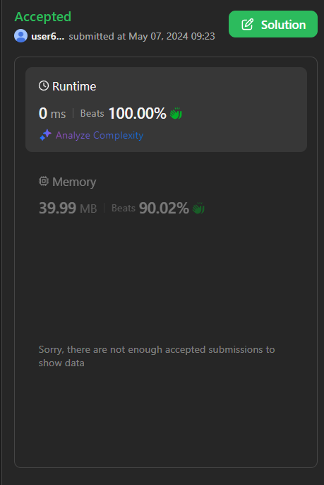 - O(1) : 추가적인 배열이나 리스트를 사용하지 않고, 상수 개수의 변수만 사용하므로 공간 복잡도는 O(1)입니다.