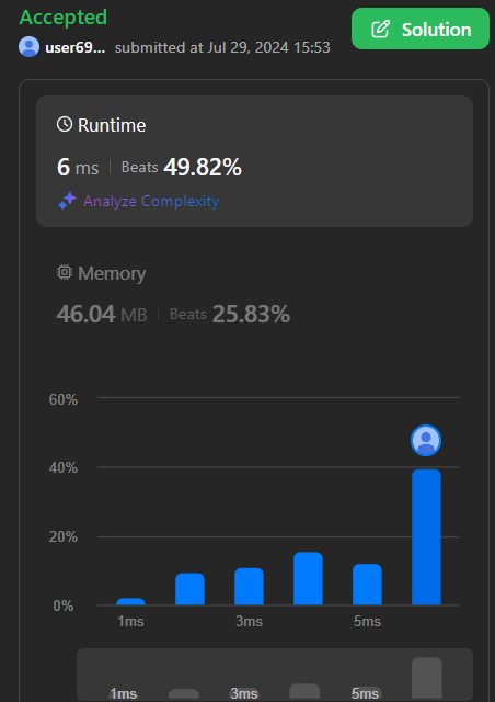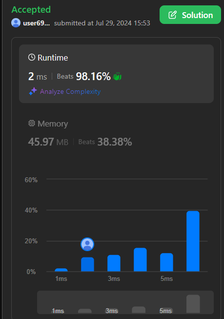 시간, 공간 복잡도는 제 코드랑 동일합니다만 Runtime 결과가 저랑 차이가 조금 있습니다.