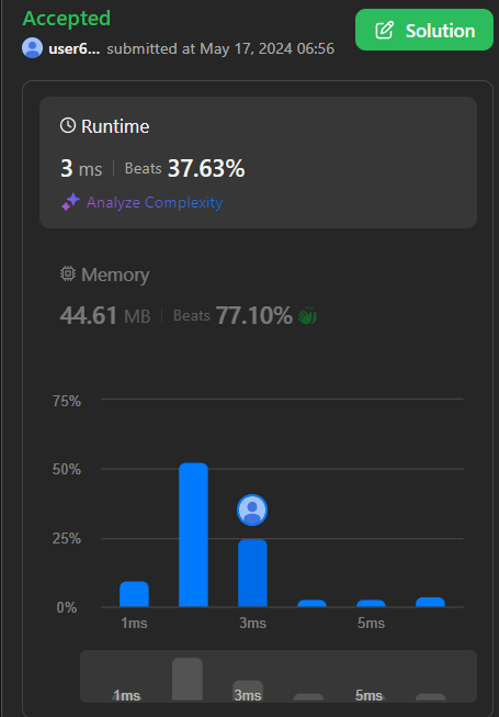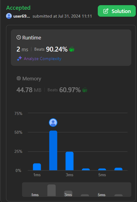- 배열 nums의 길이를 n이라고 할 때, 배열의 각 요소를 한 번씩 검사하므로 시간 복잡도는 O(n)입니다.