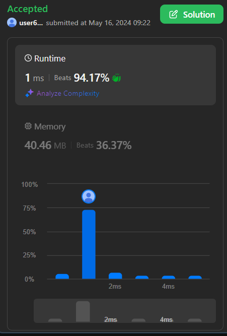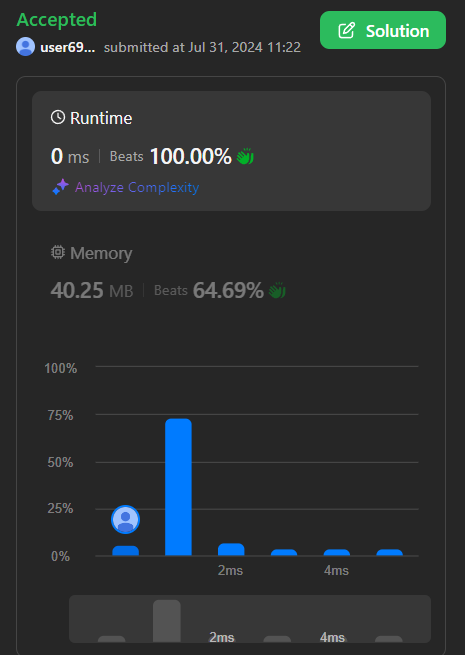 이로써, 아주 효율적인 코드가 나옵니다. 사실 저는 제 코드가 Beats 100 %일 줄 알았는데, 누군가가 더 나은 퍼포먼스를 했더군요. 보니까 제 코드랑 진짜 거의 똑같지만 확연한 차이가 하나 있습니다. 바로 보시죠
