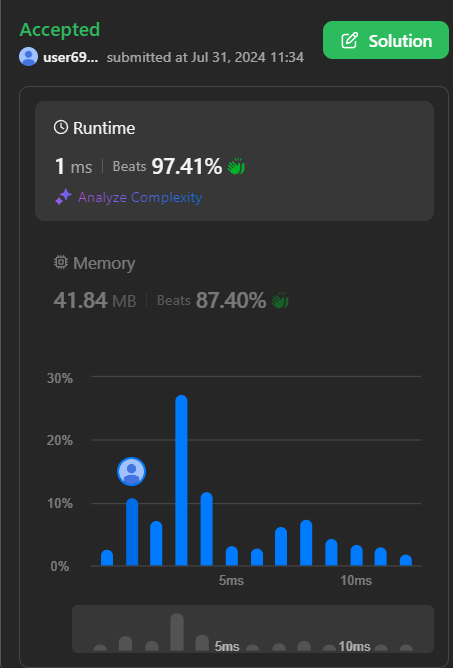 이 분은 ASCII 코드 특징을 이용하셨고, character 배열을 사용하셨습니다. 시간, 공간 복잡도는 제 코드와 동일합니다만, 더 혀율작인 코드를 쓰셨습니다. 하나, 전 그래도 제 코드가 더 읽기 쉽고 이해하기 쉽다고 생각됩니다. 여러분들의 생각은 어떤지 궁금합니다.