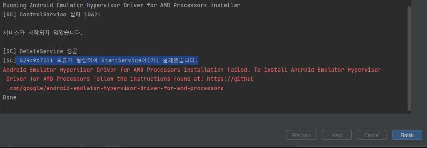 AMD 기반 시스템에서 Android Studio의 AVD를 실행할 때 발생하는 4294967201 오류는, AVD 실행 시 필요한